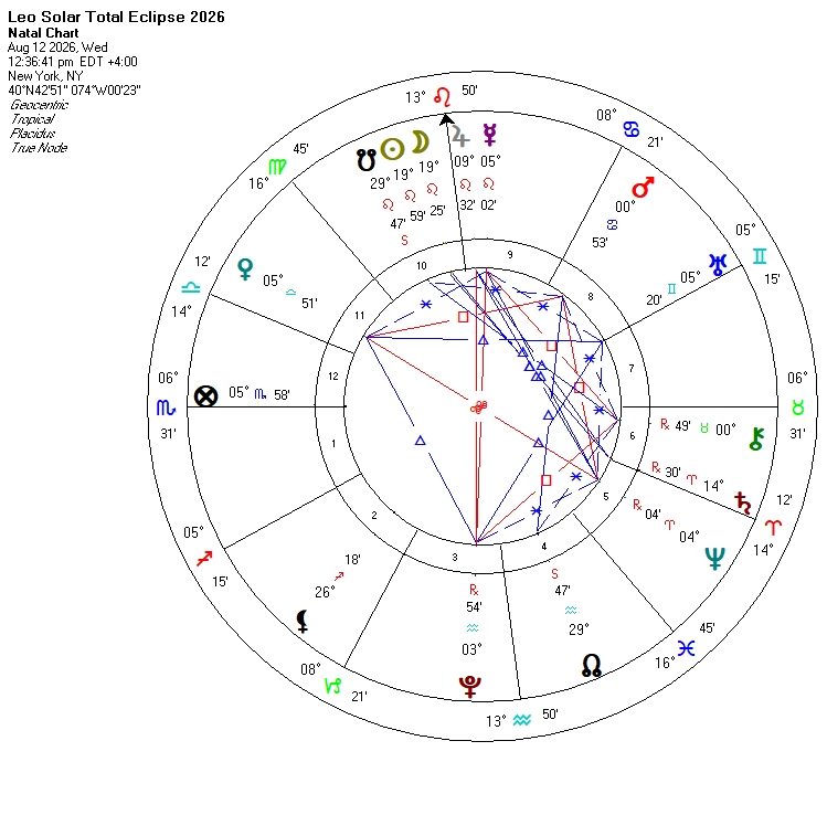 The final solar eclipse of 2026 is a Leo Solar Eclipse that arrives on August 12. Where the Sun is in his detriment in the Aquarius Solar Eclipse (not good, astrologically speaking), the Sun is in the sign of his rulership in Leo. This eclipse looks very positive to me; the eclipse Sun and Moon are trine Saturn in Aries; Jupiter and Mercury are in high-vibe positions in Leo; and the only planet not ruled by the Sun in this chart is Venus, who is in her rulership in Libra.