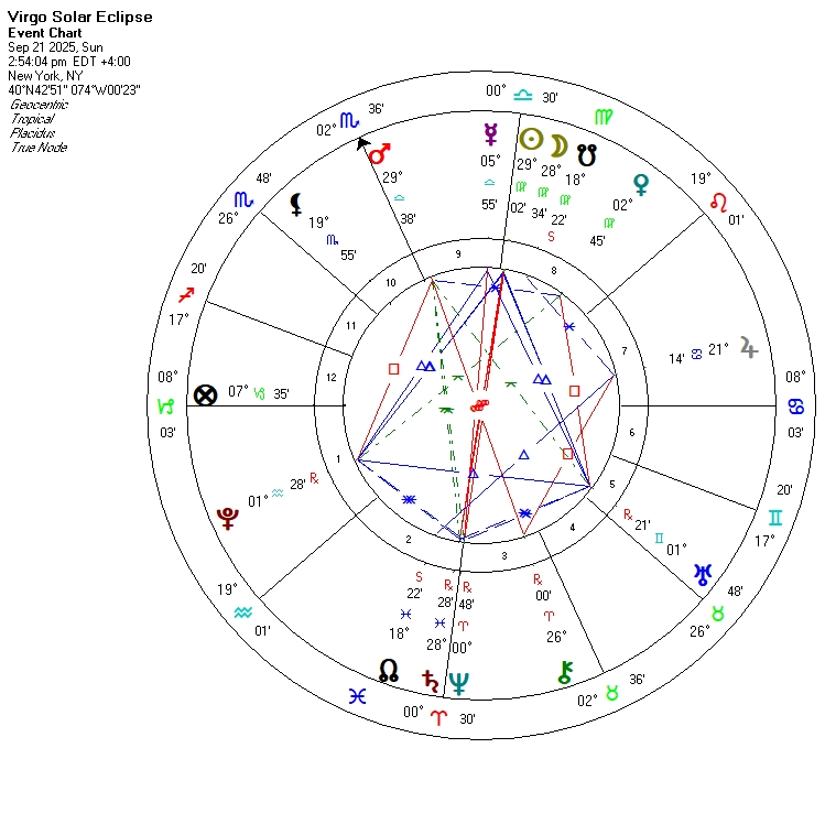The 2025 Virgo Solar Eclipse belongs to the “9 New South” Saros family. The first eclipse in this family contained a Mercury-Saturn-Neptune conjunction and the eclipse Sun and Moon were on the Venus/Pluto midpoint.