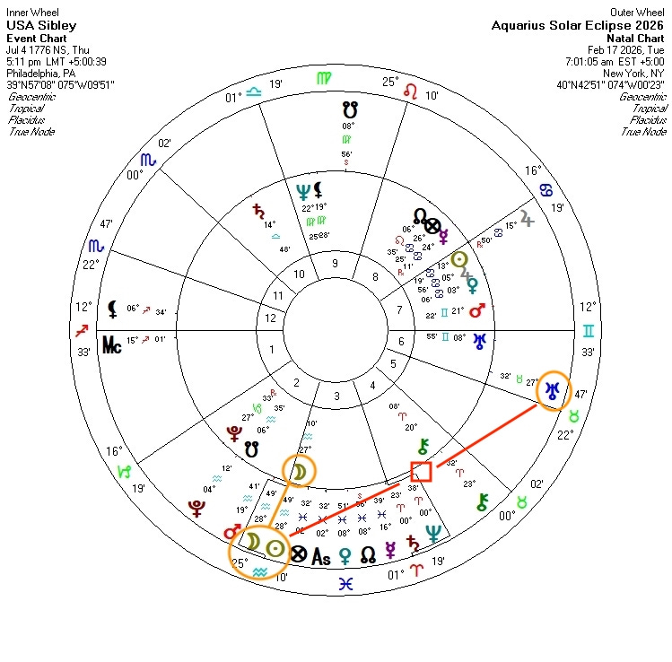 This chart shows tomorrow’s eclipse Sun and Moon conjunct the U.S.A.’s natal Moon with transiting Uranus in a tight square to both the eclipse degree and the U.S.A.’s Moon.
